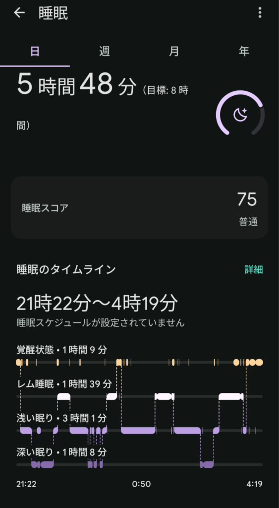 意外と寝ているつもりでも、実際は覚醒している時間もそこそこあり、自分が思っているよりも睡眠時間を確保する必要があるのだなという気づきを得ることができました。