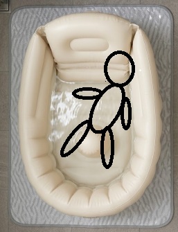 特に新生児期などは身体がふにゃふにゃなので、何も支え無しで赤ちゃんを置くと下の写真のようにベビーバスの中で左右どちらからに倒れていきます。